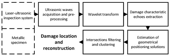 Novelties of this work include a new damage pattern tracking method over the WT-based time-frequency maps, and a time of flight-based damage localization and visualization procedure; both are supported by the application of a density-based spatial clustering algorithm in order to identify the highest probability regions of damage location. It must be noticed that for the first time, to the authors’ knowledge, this processing scheme and this damage visualization procedure have been used in the laser-ultrasonic inspection of metallic specimens. According to the obtained results, the proposed methodology is reliable and feasible for defect detection and quantification of metallic damages in industrial applications since the proposed method does not require any reference information.