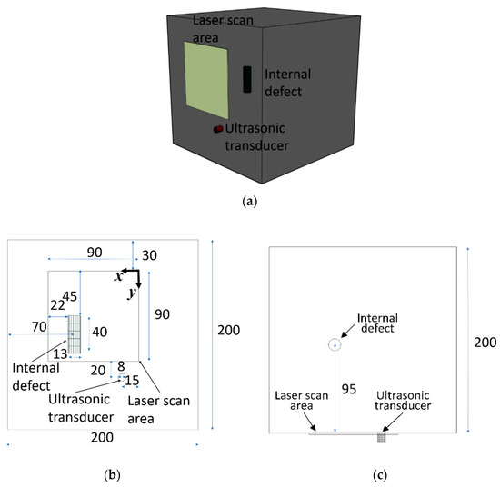 Aluminum specimen, internal damage and laser scan area. All dimensions are in millimeters. (a) Isometric view. (b) Front view. (c) Top view.