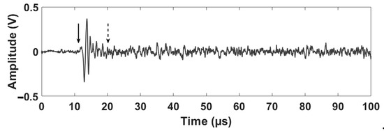 The time of the initial ultrasonic wavefront arrival to the ultrasonic sensor in Figure 4 can be detected visually at the time 12.25 µs. Although the damage effect in the time domain of the recorded ultrasonic signal is not detectable, such influence can be expected at time 20.50 µs. This is calculated theoretically as follows [39]: