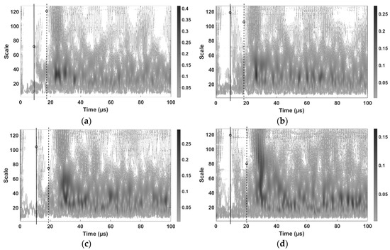 Time-frequency maps of ultrasonic waves induced at different scan points. The dotted line, represents direct ultrasonic wave arrival, the solid line, ultrasonic defect-reflected echo arrival. The corresponding ultrasonic transducer position is x = 15 mm and y = 110 mm, and the positions of laser scan points are: (a) x = 11 mm and y = 71 mm (b) x = 11 mm and y = 51 mm. (c) x = 31 mm and y = 41 mm. (d) x = 81 mm and y = 41 mm.