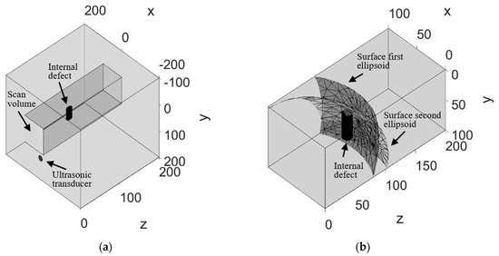Resulting ellipsoid intersections from two-second echo TOFs estimated during the proposed analysis of two laser-generated ultrasonic waves experimentally measured. (a) Isometric view of the scan volume allocation. (b) Details of the scan volume and the intersection of two resulting ellipsoids and its coherence with regard to the defect position. The first ellipsoid results from the ultrasonic transducer’s position, scan point 1 position, and TOF 17.4 mm. The second ellipsoid results from the ultrasonic transducer’s position scan point 2 position, and TOF 18.6 mm.