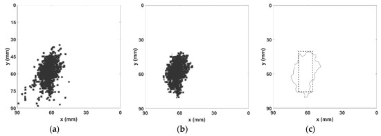 In Figure 7c, we only show the boundary of the resulting clustered set with the superposition of the actual defect location in order to compare the results with the exact position of the defect. The application of the proposed method results in a geometrical defect location estimation centered at x = 62 mm and y = 69.5 mm, while the actual defect location center is at x = 61.5 mm and y = 65 mm, thus, revealing a positioning error of 4.53 mm. Considering the size of the defect, the proposed methodology results in an estimation of 578 mm2, while the actual dimension of the defect’s cross section area is 520 mm2, thus, resulting in an error of 11.1%.