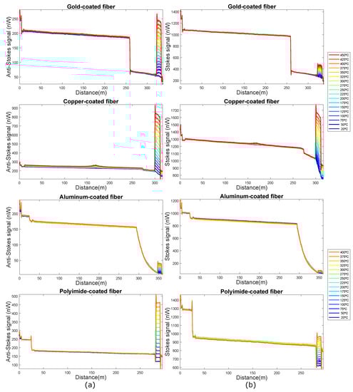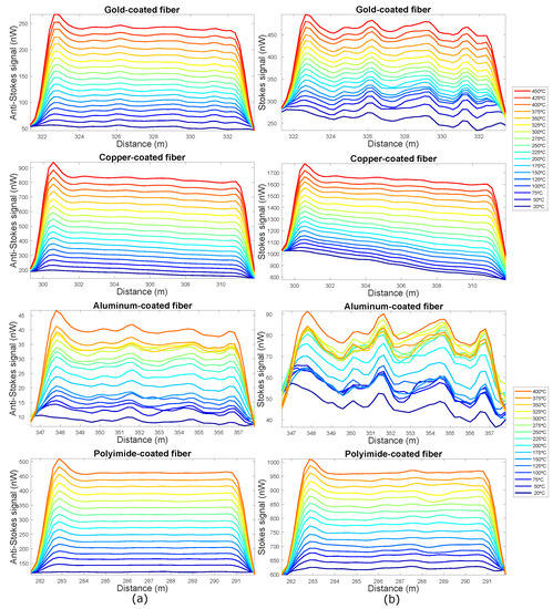 (a) Anti-Stokes and (b) Stokes signals obtained for gold-coated, copper-coated, aluminum-coated and polyimide/carbon-coated fibers (from top to bottom respectively) in the entire fibers under test (FUT).
