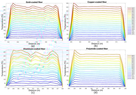 Temperature profile for (a) gold-coated; (b) copper-coated; (c) aluminum-coated and (d) polyimide/carbon-coated fibers in the hot-spot zone.