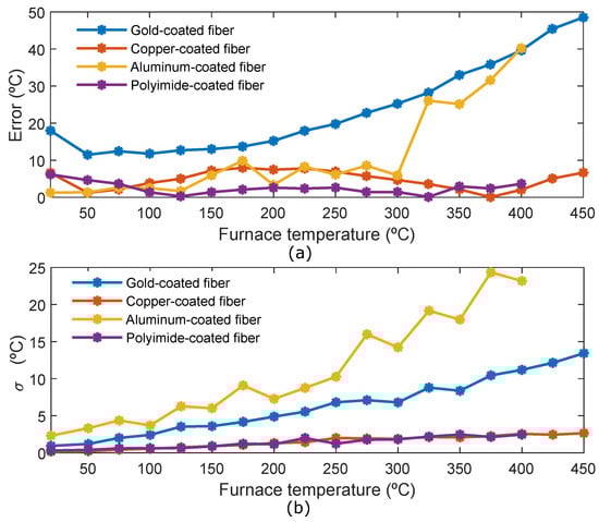 Figure 6a shows the mean error of the hot-spot section for the four fibers. The error has been calculated as the absolute value of the difference between the real oven temperature and the average temperature of the hot-spot section. The polyimide-coated fiber is the fiber that presents the minimum error, remaining constant with temperature. The highest error obtained is 6 °C at room temperature (probably because the room temperature has been considered 20 °C to calculate the error in all the fibers, however small changes could have been produced in this value when the measurements with polyimide fiber were carried out). Copper coated fiber also has a small and practically constant error with temperature, the biggest error is 7.9 °C for temperature = 175 °C. In the aluminum-coated fiber the error triggers from 300 °C, and, its error is almost 40 °C at 400 °C. The gold-coated fiber is the one with the biggest error, which increases with the temperature.