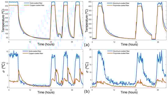 The variance of the hot-spot section for the four fibers is shown in Figure 7b. It can be observed, as in previous results, that the variance associated with both gold and aluminum-coated fibers is higher (reaching 25 °C approximately in the aluminum-coated fiber). In the case of the copper-coated fiber, the variance is lower, except when the temperature is ramped down to room temperature. This is probably because the fiber inside the furnace is not kept constant. Finally, the polyimide-coated fiber exhibits a low and constant variance in all cycles.