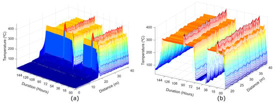 Figure 8a shows the results of the temperature distributed measurements performed using a spatial resolution of 0.5 m. The measurement time of each trace and the time between two consecutive measurements were 60 s and 5 min, respectively. For a clear observation of the two temperature cycles applied to the fiber, Figure 8b presents only the hot-spot zone.