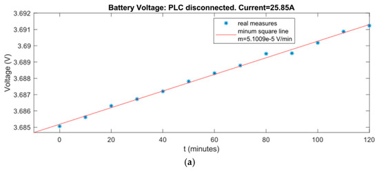 (a) Battery voltage: PLC disconnected; (b) Battery voltage: only reception; and (c) Battery voltage: sending and receiving.