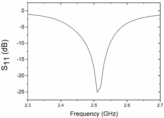 The microchannel was modeled as a three-dimensional dielectric body embedded in a finite-size dielectric substrate. The result of the electromagnetic simulations of the reflection coefficient (S11) in the input port of this sensor is presented in Figure 2. As we can see, the resonant frequency was tuned to 2.51 GHz under the condition of a microchannel loaded with deionized water (the load was modeled by assigning the dielectric constant of water to the body of the microchannel). The presence of a distinct minimum reflection coefficient (−25 dB) close to 2.5 GHz indicates that the input impedance of the resonator is well-matched to the source of a microwave signal. The same pertains to the output port (the structure is electrically symmetric). Since the resonator is a very low loss passive circuit, and deionized water introduces no loss, we can conclude that almost all microwave power is transmitted from the input to the output port of this structure at resonance. The change in the dielectric constant of the microchannel detunes the resonator, so the signal transmitted at the original resonant frequency will start to reflect at the input port of the sensor. This, in turn, will decrease the amplitude of the signal at the output port of this sensor. In this way, we obtain information about any changes in the dielectric properties of the (bio)chemical compound that flows through the microchannel. It is also worth mentioning that the operating point of the sensor can be put in the slope of the S11 curve (by selecting a lower or higher frequency), so the output signal can increase or decrease, showing the direction of the changes in the test fluid.