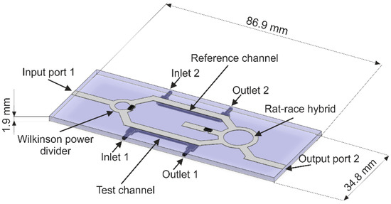 The construction of the sensor was based on [20]. Its CAD model is presented in Figure 3. The structure contains a few connected microstrip elements, which consists of input and output microstrip lines, Wilkinson’s 3-dB power divider, the rat-race hybrid (the ring coupler) and two microstrip lines (reference and test) in between. We can also see two microchannels, with coupled inlets and outlets. The microwave circuit is printed on a dielectric substrate and the two microchannels are embedded in the substrate just beneath the reference and the test line, respectively.