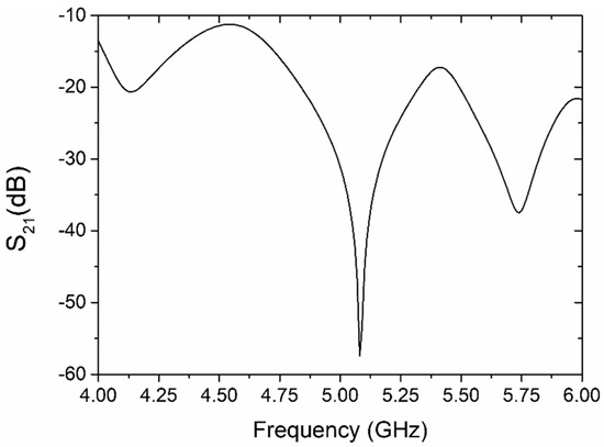 The sensor was designed using electromagnetic numerical simulations. The numerical modeling and analysis were performed by means of the COMSOL Multiphysics software. We modeled the structure of the coupler-based sensor based on the same assumptions as in the case of the resonator-based sensor. The operating frequency (f0) of this sensor was tuned to ca. 5 GHz under the condition of reference and test channels that were filled with the same fluid (deionized water). In Figure 4, we can see the simulated transmission coefficient (S21) between the input and output port of the sensor (a ratio of the output and input power). The deep minimum in the vicinity of 5 GHz (−57.3 dB at f0) means that there is an almost ideal cancelation of the interfering signals, and this means that both channels have been filled with the same fluid. Now, when the properties of the fluid inside the test channel are changed, a non-zero signal at f0 is produced at the output port. This effect can also be observed as a shift of the minimum in S21 to the right or left, provided the impedance of the test line does not change much. The sensitivity of this type of sensor depends on several factors: the quality of impedance matching at the input and output ports of the microwave circuit, the accuracy of phase balance between the reference and test lines, and the isolation of both the power divider and the ring coupler. All of these requirements are strongly related to the accuracy of the technology that will be used in the fabrication of the sensor.