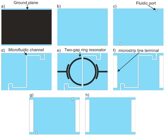 The device consisted of 12 LTCC layers. Each was 165-um thick before firing. The sensor layout is presented in Figure 5. Three layers define the bottom of the sensor (Figure 5a,b). The lowest layer (Figure 5a) was covered by a silver paste to form the ground plane. The 2 subsequent layers (4th and 5th) consist of cuts for fluidic ports (see the pattern in Figure 5c). The microfluidic channel makes up the next 3 layers (Figure 5d–f). The two-gap ring resonator and microstrip lines are printed on the middle layer, as shown in Figure 5e. The 9th and 10th layers contain cuts for microfluidic inlets and outlets, and for microstrip line ports (Figure 5g). The last two layers (Figure 5h) define the top of the sensor.