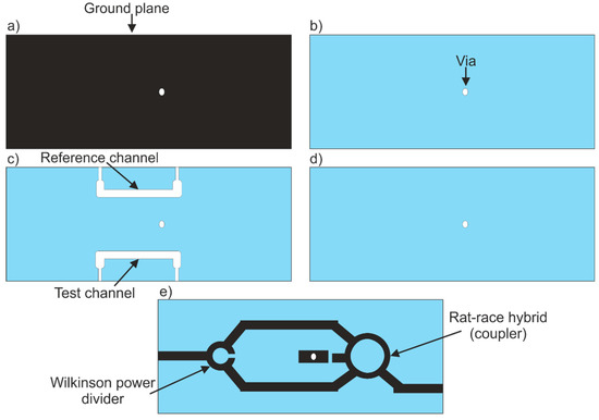 Nine layers of a 254 µm-thick (before firing) LTCC material were used to make a coupler-based sensor. All the patterned layers are presented in Figure 7. The bottom of the sensor consisted of 3 layers (Figure 7a,b). The 1st was covered with a silver paste to form the ground plane (Figure 7a). The reference and test channels were cut into 3 middle layers (Figure 7c). The channels were sealed by 3 layers (Figure 7d,e). The microstrip lines, Wilkinson power divider and rat-race hybrid were deposited on the surface of the top layer (Figure 7e).
