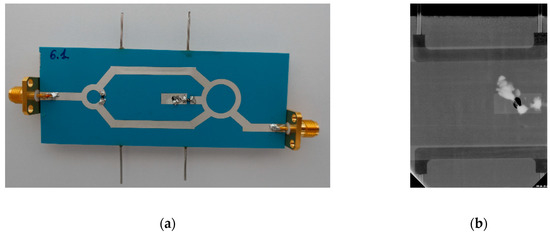 The resonator-based sensor made with LTCC technology and an X-ray image of its fragment are presented in Figure 6. As can be seen in Figure 6b, the microchannel and resonator gap are properly aligned.