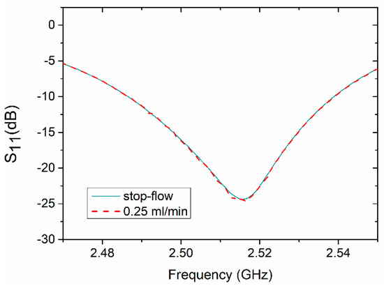 The reflection coefficient (S11) of the sensor was measured to detect the fluid in the microchannel. In order to determine the influence of the continuous flow on the results, the reflection coefficient was measured under two different conditions (modes). First, the microchannel was filled with deionized water and the flow was stopped during measurement (stop-flow mode). Then, the measurements were performed with a continuous flow (0.25 mL/min) of deionized water. As we can see in Figure 10, there is no significant difference between both measured reflection characteristics. The difference is negligibly smaller than 0.005 dB. Moreover, the resonance frequency was the same in both cases.