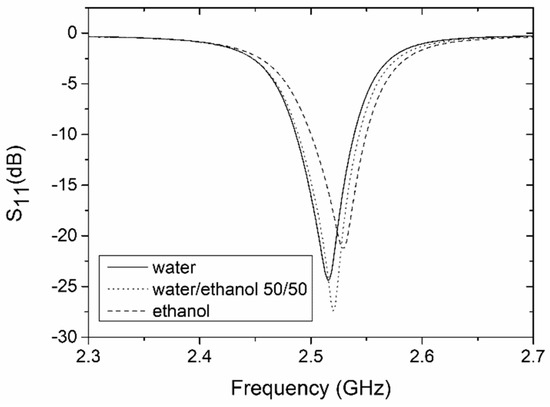 The rest of the measurements were taken under a continuous flow. In order to detect changes in the test fluid, we decided to observe the shift in the sensor’s resonant frequency. The measured S11 for the deionized water, the 50/50 water/ethanol mixture, and the ethanol as a function of the frequency, is presented in Figure 11. The resonant frequency of the system filled with deionized water was 2.515 GHz, where a minimum reflection of −24.4 dB was measured. We can observe good agreement between the simulated (S11 = −25 dB at 2.51 GHz) and measured (S11 = −24.4 dB at 2.515 GHz) results when we compare Figure 2 and Figure 11.
