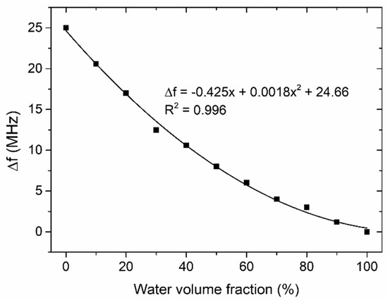 The resonance frequency variation as a function of the water volume fraction in a water/ethanol mixture.