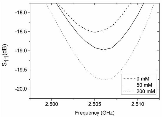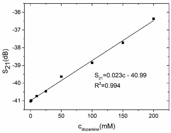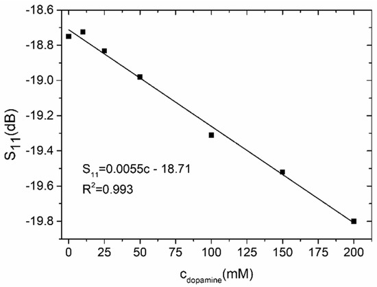 The resonant frequency for the microchannel filled with a pure buffer was ca. 2.5 GHz, and it did not change significantly (less than 1 MHz) when the microchannel was filled with dopamine concentrations. However, the reflection magnitude decreased with the increased concentration of dopamine. The magnitude of S11 changed from −18.5 dB (for pure buffer) to ±19.8 dB (for 200 mM of dopamine). The reflection magnitude as a function of the dopamine concentration is shown in Figure 14. Theoretically, it would be possible to measure a dopamine concentration of 50 mM. However, very low sensitivity (5.5 × 10−3 dB/mM) precludes the resonator-based sensor from the practical testing of the dopamine concentration. Based on the obtained results, it can be concluded that the presented LTCC resonator-based sensor is better suited to testing the composition of liquid samples.