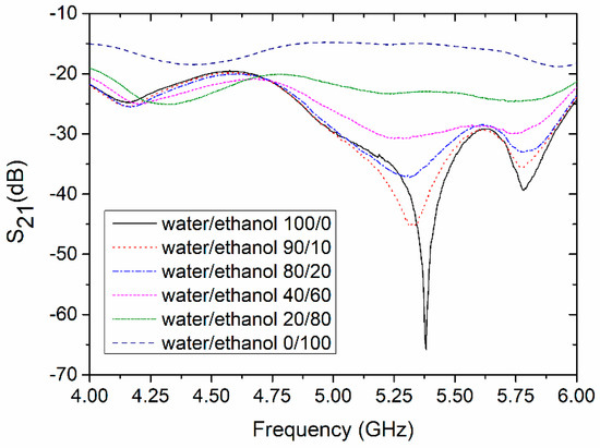 For the test channel filled with a mixture of water and ethanol, the operating frequency shifted to 5.33 GHz and the transmission magnitude decreased with the increase of ethanol in the mixture. The S21 parameter was used as a sensing indicator. Its value as a function of the volume fraction of deionized water in the water/ethanol mixture is shown in Figure 16.