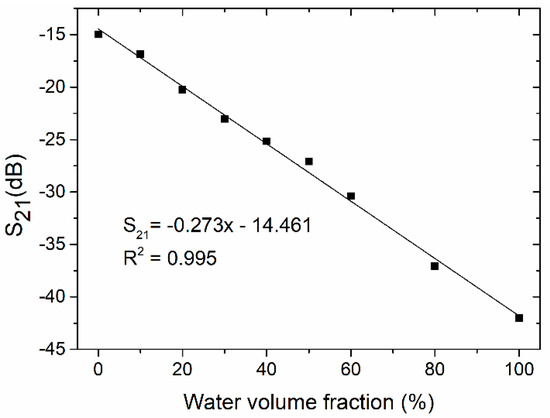 As we can see, the decrease in magnitude of S21 was proportional to the water content in the test mixture. As a result, a linear relationship was achieved (R2 = 0.995). The slope of the S21 curve was equal to 0.273 dB per unit volume fraction of water.