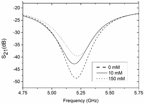 The resonator-based sensor was also applied to determine the concentration of dopamine in a liquid sample. Commonly, for the detection of dopamine, the electrochemical or optical method (fluorescence measurement) is used. However, both methods require the preparation of the analyte prior to taking measurements. For example, in the case of fluorescence measurements, the enzymatic oxidation of dopamine to dopamine-o-quinone, and then to polydopamine is carried out. This requires the immobilization of the enzyme (laccase) inside the microfluidic system. This process is both complicated and time-consuming [29]. To demonstrate the possibility of the direct detection of dopamine, the resonator-based sensor was used. The measured reflection coefficient of the sensor, for various concentrations of dopamine as a function of frequency, is presented in Figure 13.