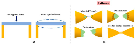 After billions of operations, microcontact area deterioration can severely impact the switching performance, which may ultimately cause device failure. Recently in [7,8], it has been demonstrated that material transfer, molten metal bridge (MMB), and contact delamination contribute to contact degradation after a certain number of switching cycles (Figure 1). Switching dynamics (e.g., contact force, contact closure time, and contact bounce), and microcontact surface tribology (e.g., contact resistance, contamination, adhesion, and material transfer) play the critical role in determining their reliability. A simple, quick, versatile, and efficient test fixture is required to study the contact surface tribology as well as to optimize the switching dynamics. Past studies have shown actual MEMS devices, modified nanoindentors, scanning probe microscopes (SPM), and atomic force microscopes (AFM) being used to perform microcontact reliability and performance studies. However, each of these test setups has limitations in microcontact data collection for showing acceptable device reliability. For example, an MEMS device-based test setup does not allow one to measure the contact force directly, and AFM, SPM, and nanoindentation are limited to cycle rates of 10–100 Hz [9,10,11,12].