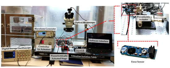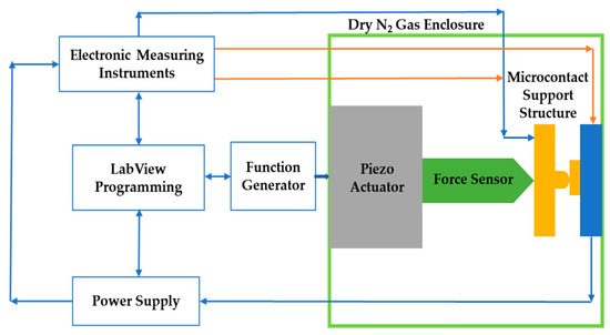 Figure 3 shows the experimental setup for calibrating individual and integrated performance of Thorlabs’ PAZ005 piezoelectric actuator (Thorlabs Inc., Newtown, NJ, USA) and FemtoTools’ FT-S1000 force sensor (FemtoTools, Buchs, Switzlerland) using a Thorlabs’ BPC-303 controller (Thorlabs Inc., Newtown, NJ, USA). Each of them was tested and calibrated prior to assembling into the test fixture. The piezoelectric actuator was integrated in the test fixture to provide 10–900 µN force with the displacement range of 0–20 µm. It has both open loop control and close loop control options, each with different speeds and accuracies. Close loop control is comparatively slower but more accurate than open loop control. Therefore, close loop control was appropriate for initial contact testing (ICT). Even though open loop control is faster, it suffers from hysteresis. While operating at maximum cycle rate, both control mode operations are greatly affected by the piezoelectric actuator’s capacitive load, circuit conditions, and system’s mass. This effect was minimized through a proportional-integral-derivative (PID) controller and a function generator. A force sensor with high sensitivity (i.e. μN resolution) and high resonance frequency was attached to the piezoelectric actuator to perform the test at cycle rates up to 5 kHz. This force sensor has a 50 μm × 50 μm square sensing area which was aligned to the other components in the fixture through the mounting/alignment fixture.