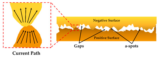 In [16], the equation for constriction resistance was modelled without considering the contact surface contamination. This model is well suited for a smooth macro-contact surface. However, at the micro/nano scale, contact surfaces are not perfectly smooth, and, thus, surface contamination is significant at microcontact region [17,18]. At this scale, it has also been explored that the contact surfaces are formed from ridges and tops named asperity peaks or “a-spots,” which usually provide the conducting path for electrons (Figure 4).