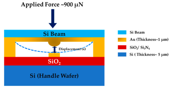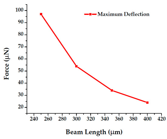 Furthermore, we performed FEA for displacement with respect to beam length at 100 µN force (Figure 16b). The result suggests that we can tune the maximum displacement by altering either beam length or applied force. However, in our experimental setup, the contact gap was around 300 nm. Therefore, we did simulations to find out appropriate force to achieve our desired 300 nm deflection.