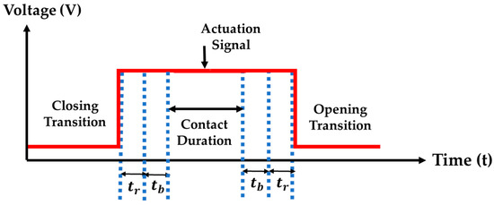 Typical timing diagram associated with microcontact actuation signal. The red pulse represents the time elapsed by an actuation signal, the first dotted blue line represents the time delay associated with the piezoelectric actuator (), and the second dotted blue line represents mechanical contact closure time associated with a Si beam ().