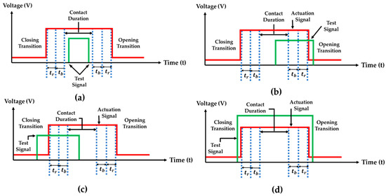 Illustrations of relative timing with respect to test signal: (a) Cold-switching, (b) hot closure, (c) hot opening, and (d) hot-switching.