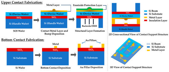 The contact support structure was fabricated using both the surface and bulk micromachining process of a silicon on insulator (SOI) wafer. The SOI wafer consists of a 500 µm thick handle wafer (resistivity ~1000 Ω-cm), 2 µm thick buffered oxide layer, and a 5 µm thick device layer (resistivity ~1000 Ω-cm). Initially, the contact layer metallization was performed. A series of hemispherical upper contact bumps, ranging in size from 2–8 μm in diameter, were patterned and deposited. A planar circular pattern was converted into a hemispherical shape by partial heating reflow at high temperature. Afterwards, a 300 nm gold (Au) planar metal contact layer was deposited through the sputtering process. Right before that, a 10 nm titanium (Ti) adhesion layer was deposited. Then, the device layer was patterned and etched down to buried oxide layer through reactive ion etching (RIE) process to attain the bridge structure. This Si layer with sputtered gold (Au) metal layer was exploited as a structural layer and was temporarily covered by a protection layer during the backside deep reactive ion etching (DRIE) Bosch process (Figure 9). A cavity was formed within the handle wafer by implementing DRIE to facilitate to release the switching structure. Moreover, it provided space for the force sensor for contact force measurement. Lastly, the buried oxide (BOX) layer of the SOI wafer was etched out from the handle side of the wafer by RIE. In this way, the upper contact support structure was released.
