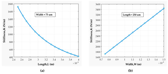 Stiffness variation with respect to (a) beam’s length and (b) beam’s width.