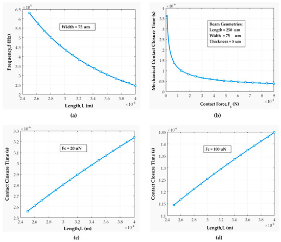 (a) Resonance frequency with beam’s geometry; (b) mechanical contact closure time with available contact force; (c) mechanical contact closure time versus beam length for 20 µN contact force; (d) mechanical contact closure time versus beam length for 100 µN contact force.