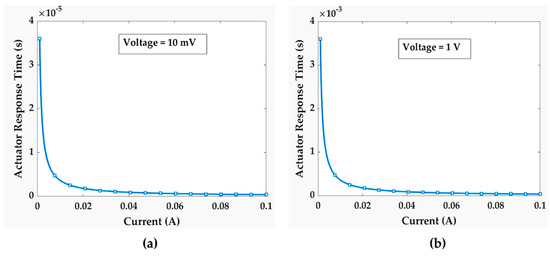 Actuator response time under different circuit conditions; (a) 10 mV; (b) 1 V.