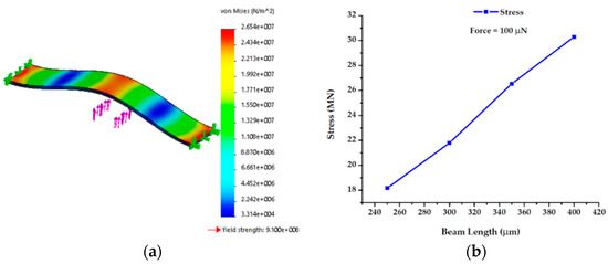 (a) Stress analysis of beam length under point force; (b) beam length versus Stress at 100 µN force.