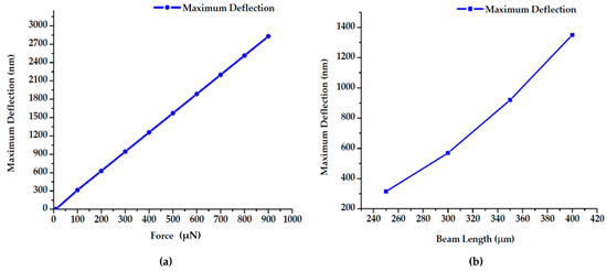 Figure 16 represents displacements of a doubly fixed beams of 250 µm long and 75 µm wide at 10–900 µN force. At this range of force, maximum displacement was seen at beam’s center region and it can expand from ~250–2800 nm (Figure 16a).