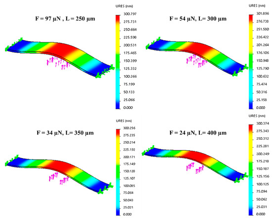 We attained ~300 nm displacement by considering different beam length and applied force values. The fixed-fixed beam’s maximum displacement due to single point load at center can be expressed as [27,28,29],