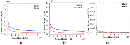 (a) Contact resistance; (b) contact voltage; (c) contact temperature of a single gold (Au) asperity contact for elastic and plastic region.