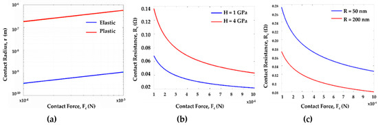 (a) Contact radius of a single gold (Au) asperity for elastic and plastic region; (b) contact resistance with varied hardness for a gold (Au) “a-spots”; (c) contact resistance of a single gold (Au) asperity contact with varied radius of curvature.