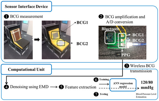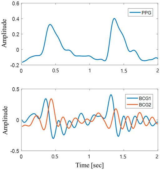 However, while estimating blood pressure using PTT, users must consciously make measurements using ECG and PPG sensors to obtain their blood pressure. To address this issue, techniques for non-intrusive measuring of biometric signals have been developed, thus improving the convenience of measurement [11,12,13]. One of the biometric signals used is the ballistocardiogram (BCG) signal, which measures the movement of the body during cardiac contraction and relaxation. Studies have been actively carried out using radar and polyvinylidene fluoride resin (PVDF) films to measure blood pressure using BCG signals. Further, other studies have estimated blood pressure by calculating PTT using BCG, PPG, or ECG signals for users seated on a chair [14,15]. However, measuring blood pressure using PPG cannot be considered as a fully nonintrusive/unrestricted system because the users must be conscious while measuring their blood pressure, which is inconvenient. This is because users or patients must attach their finger to PPG sensors in order to enable the measurement of PPG signals. Therefore, they would be consciously rigid while having their blood pressure measured via PPG. Moreover, BCG signals are combined with breathing or motion noises, which make it difficult to capture the maximum peak of BCG, resulting in an error in the calculation of PTT using BCG and ECG signals.