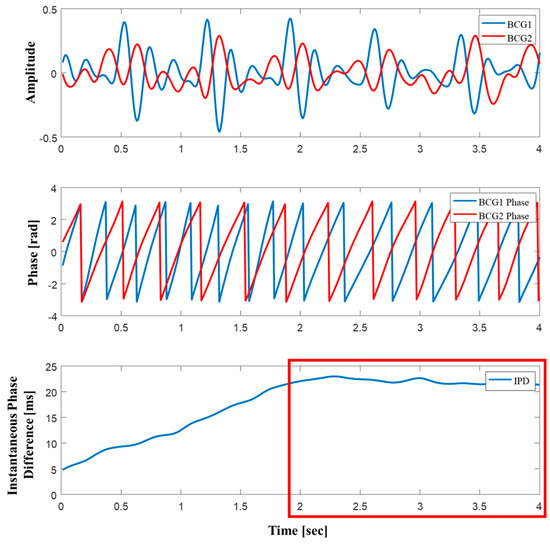 The estimation of blood pressure using PTT is greatly affected by the accuracy of finding the peak i.e., the blood pressure cannot be estimated correctly if the peak is missed from signals. Hence, while the peak was not sought, the same features as PTT were extracted from the BCG signals by using the instantaneous phase difference (IPD) method. Many researchers have used this method to estimate blood pressure from PPG signals, demonstrating its significant correlation with PTT [18,19]. The instantaneous phase was obtained from the first IMF of the two BCG signals using Hilbert transform, and then deducted to determine the IPD (see Figure 4). As shown in Figure 4, we extracted features from the part between the two BCG signals with less phase difference. To determine the PTT for comparison with IPD, the peak was found by using adaptive threshold detection [20].