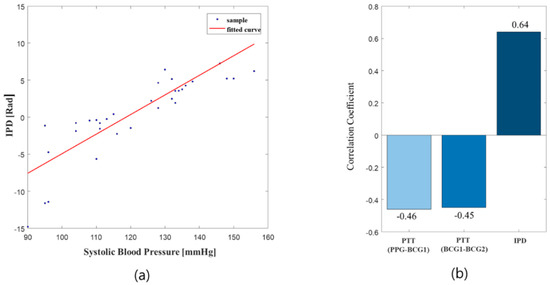 Relationships between systolic blood pressure and PTT/IPD, (a) systolic blood pressure and IPD, (b) correlation coefficient of systolic blood pressure with PTT/IPD.
