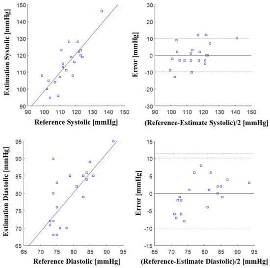 Table 1 shows the mean error (ME) and standard deviation (STD) calculated using the results of the BP estimation model created using ANN and the BP results measured with a commercial cuff-based blood pressure monitor. In this table, the ME and STD values are evaluated according to the American National Standards Institute/Association for the Advancement of Medical Instrumentation/International Organization for Standardization (ANSI/AAMI/ISO) 2013 protocol (ME < 5 mmHg, STD < 8 mmHg) [21]. As shown in Table 1, the mean deviations of the systolic and diastolic blood pressures are 0.01 mmHg and 0.05 mmHg respectively, and the standard deviations are 6.7 mmHg and 5.8 mmHg respectively, which are within the recommended criteria. These values were also within the recommended criteria when the BP estimation model was created with PTT as input values. However, the BP estimation model that used IPD as input values showed a higher accuracy for the systolic blood pressure, whereas for the diastolic pressure, the model created using PTT obtained from two BCGs showed a higher accuracy. Figure 6 shows the Bland-Altman plot and the regression plot of the estimation model using IPD, which display high accuracy.