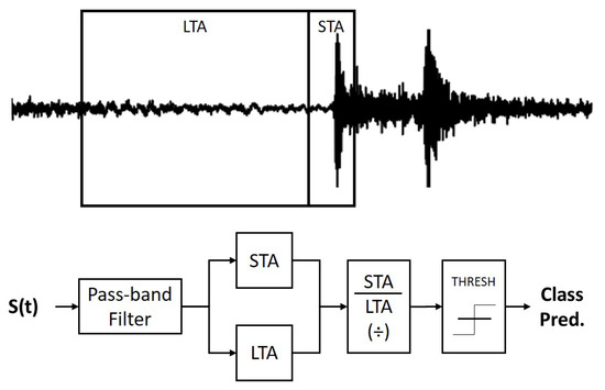 By far the most common traditional technique for seismic signal detection is the short-term average, long-term average (STA/LTA) detector, first described by Freiberger [11]. In its simplest form, this technique employs a bandpass filter to compute the characteristic function, with the predicted value equal to the long-term average and the current value equal to the short-term average. The current and predicted values are then compared via a ratio which is then subjected to some static threshold, as detailed in Figure 1. Numerous adaptations and enhancements to this STA/LTA detector have been proposed, most notably by Allen [12] and Baer [10], who increased detection efficiency by employing novel characteristic functions based on a combination of the signal and its time derivatives. More recently, modern iterations of the STA/LTA algorithm have employed multiple characteristic functions across multiple frequency bands with great success [8].