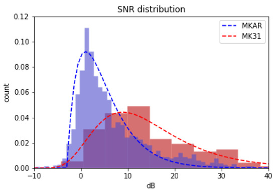 Normalized histograms showing the SNR distributions of detected signals from two seismic arrival catalogs. Both catalogs contain detections for the exact same location, MK31, which is the reference element of the MKAR seismic array. The MK31 catalog is based on a single-trace detection algorithm applied to the MK31 instrument alone, while the MKAR catalog is based on beam-formed picks from the entire 10-instrument array. The mean SNR detected by the array beam is 8 dB lower than that of the single-trace. This lower detection threshold results in nearly an order of magnitude more detections in the MKAR catalog compared to the MK31 catalog.