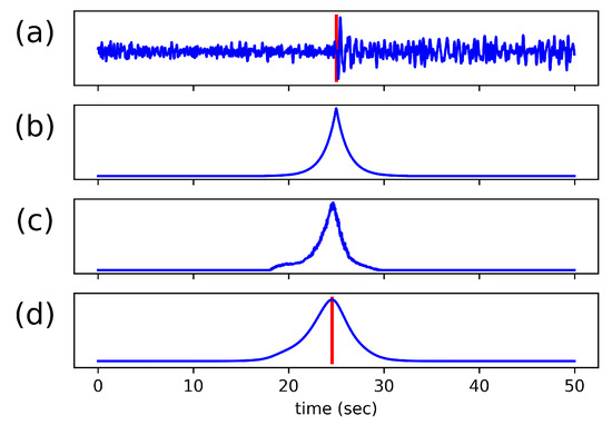(a) Input Sequence containing an arrival marked in red (b) Labeled output sequence using the exponential function. (c) Predicted output sequence from the model. (d) Cross-correlation between the predicted output sequence and the exponential function. The predicted arrival is marked in red.