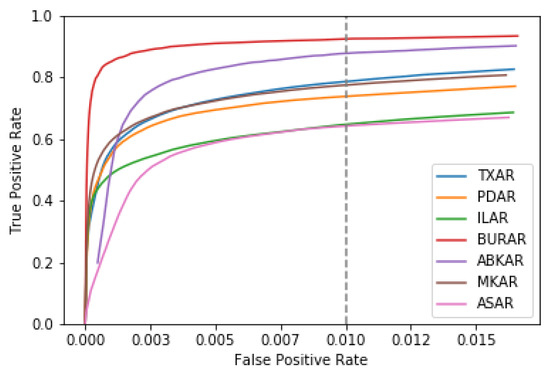 Receiver Operating Characteristic Curves for each of the seven arrays in the hold-out test set. A dashed line is shown in grey, indicating an alpha of 1%.