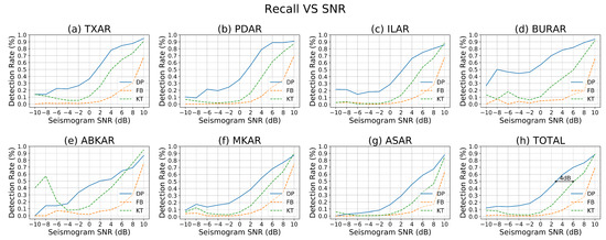 Test-set Recall, reported as a function of SNR, at a fixed type-I error rate of approximately 0.001. Results are compared directly between the three algorithms, DeepPick (DP), FBPicker (FB), and KTPicker (KT). Please note that several of the reference catalogs contain fewer arrivals below −8 dB SNR, resulting in some irregularities to the far left of the plots.