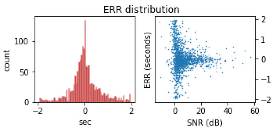 Residual analysis on the errors for the arrival time estimation task. left: Histogram showing the distribution of arrival time errors made by the algorithm against the test set, with a bin width of 0.025 s. right: Scatter-plot showing the distribution of errors with respect to SNR.